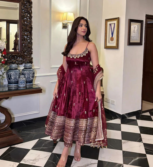 Dark Maroon Vichitra Rich Sequins Work Anarkali Gown